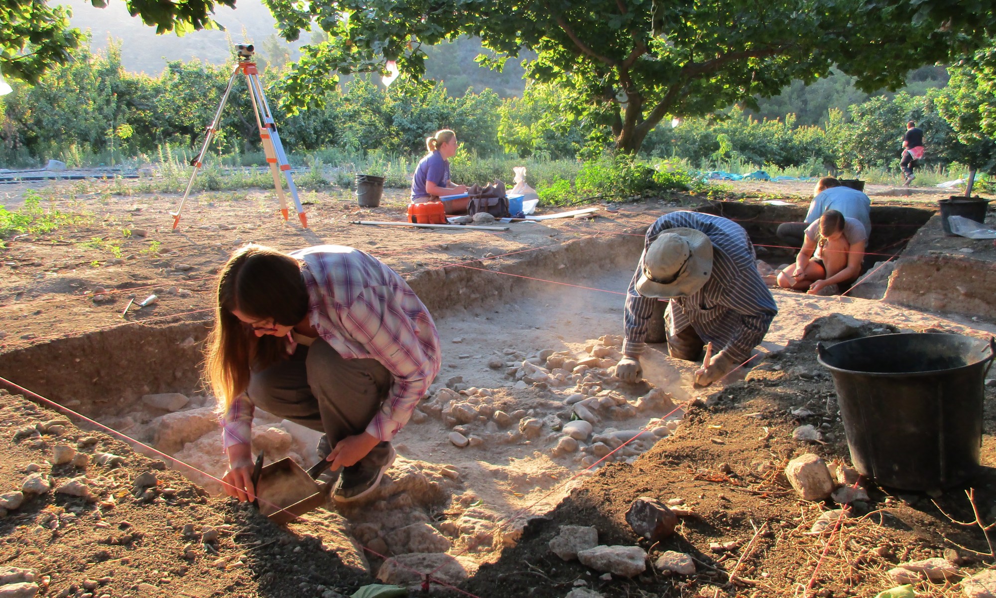 In 2019, excavations continued in two parts of the site: Area A, located in a zone of densely cultivated orchards, and Area C, located in a zone of uncultivated fields with sparse carob trees. Excavations in Area A in 2019 continued the exposure of a Chalcolithic round house with an intact floor assemblage. On the eastern exterior of the round house, excavations continued to explore a large ditch that was lined with sherds, then filled with stones and plastered over. Excavations in Area A also continued to explore the fire installation first exposed in 2018; this feature preserved parts of a heavily burned clay superstructure and, below this, a stone-lined access point set above a deep, ash-filled pit with brick fragments at the bottom. The fire installation may be related to metallurgical production, a theory that will require additional research in future seasons.